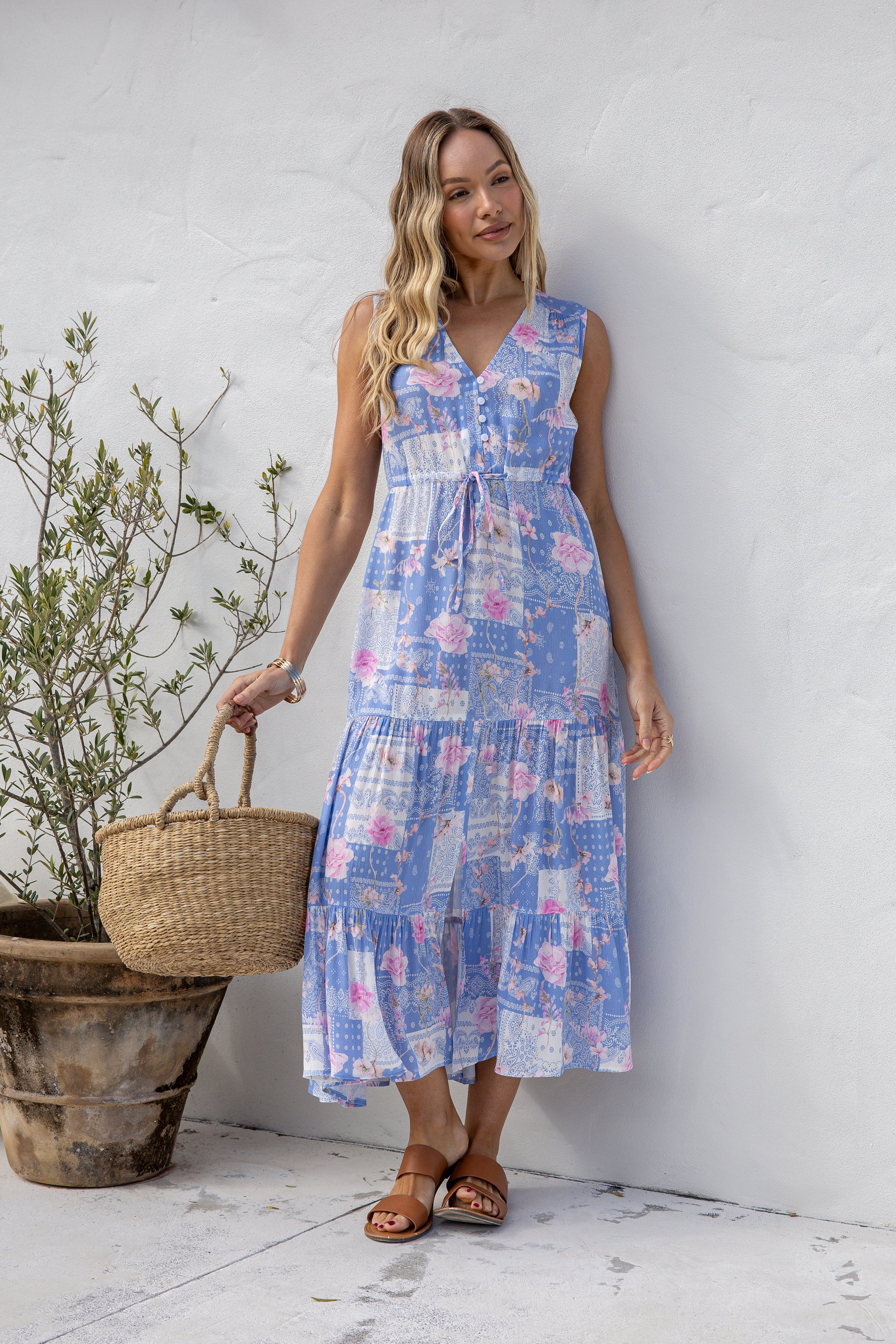 The sleeveless silhouette features a flattering V-neckline with button-front detail and a softly gathered waist with an adjustable tie for a customizable fit. Flowing into a beautifully tiered maxi-length skirt, this dress offers graceful movement and an airy, lightweight feel that keeps you comfortable all day long.